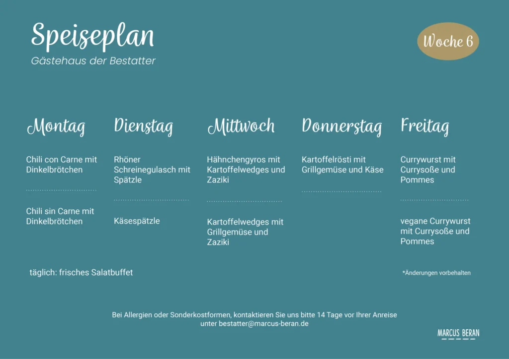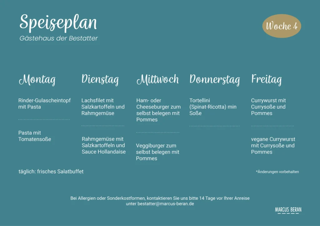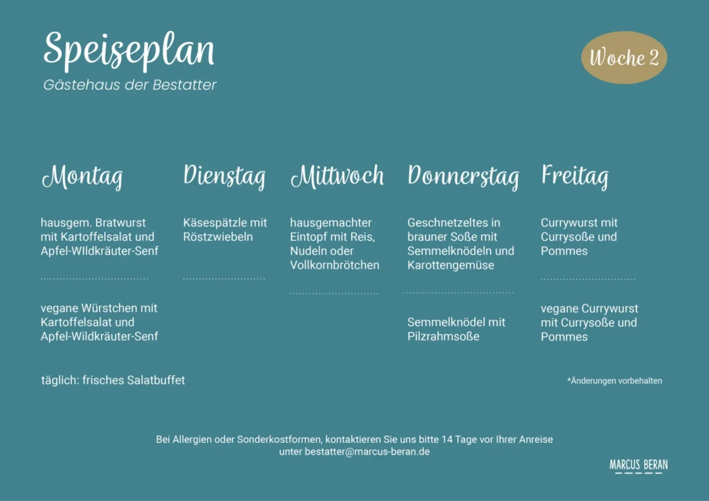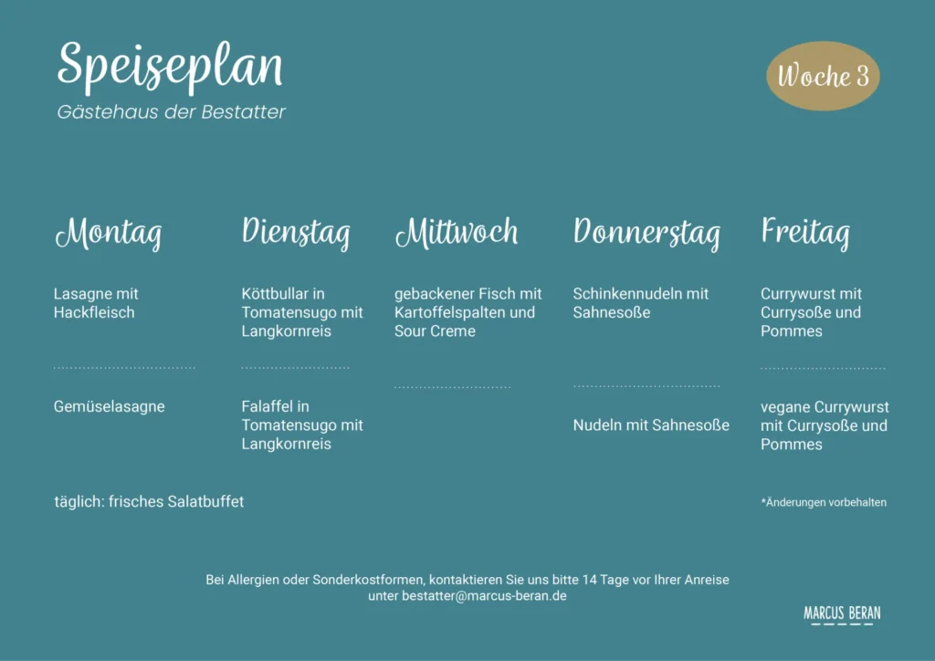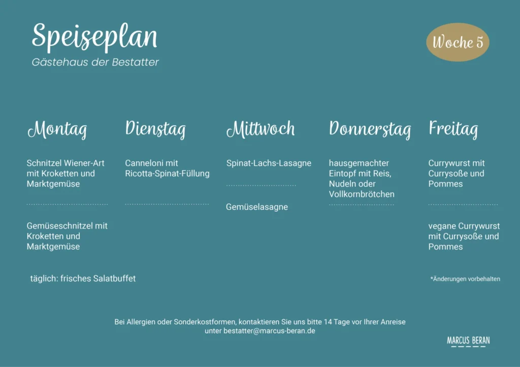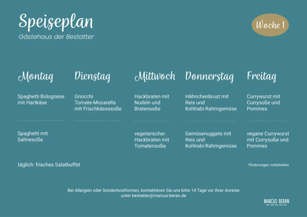 Bei Allergien oder Sonderkostformen, kontaktieren Sie uns bitte 14 Tage vor Ihrer Anreise unter bestatter@marcus-beran.de